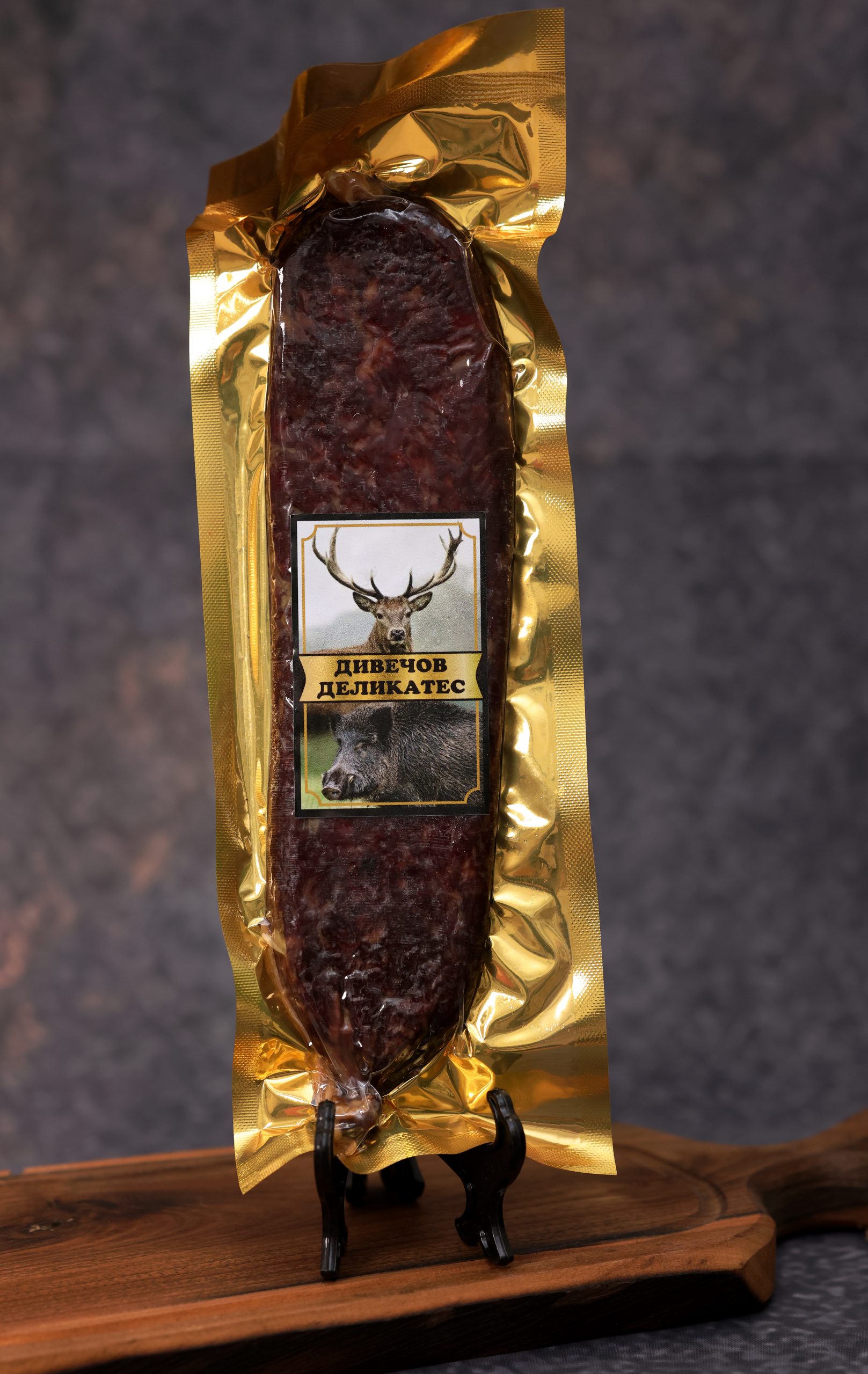 Описание на продукт:Луканка от диво прасе е автентичен месен деликатес, приготвен от чисто месо на диво прасе, смесено с подправки като черен пипер, кимион и чесън. Има характерен пикантен вкус, тъмночервен цвят и плътна текстура. Оформя се в елипсовидна форма, след което се суши и зрее в продължение на седмици. Благодарение на дивечовото месо, луканката е с по-ниско съдържание на мазнини и наситен аромат – идеална за ценители на натуралните и традиционни колбаси.